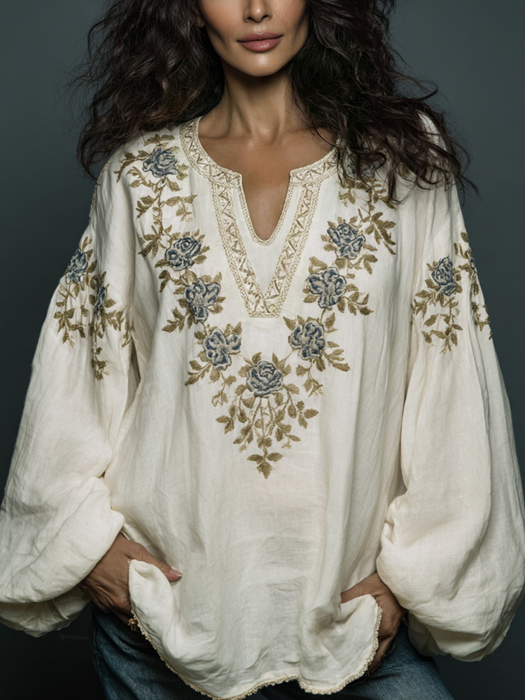 Women's Vintage Floral Embroidered Art Print Flowy Linen Blend Casual Tunic