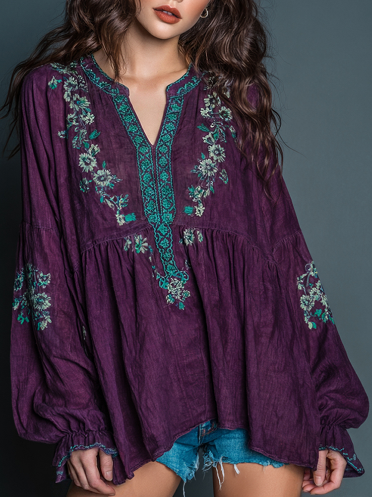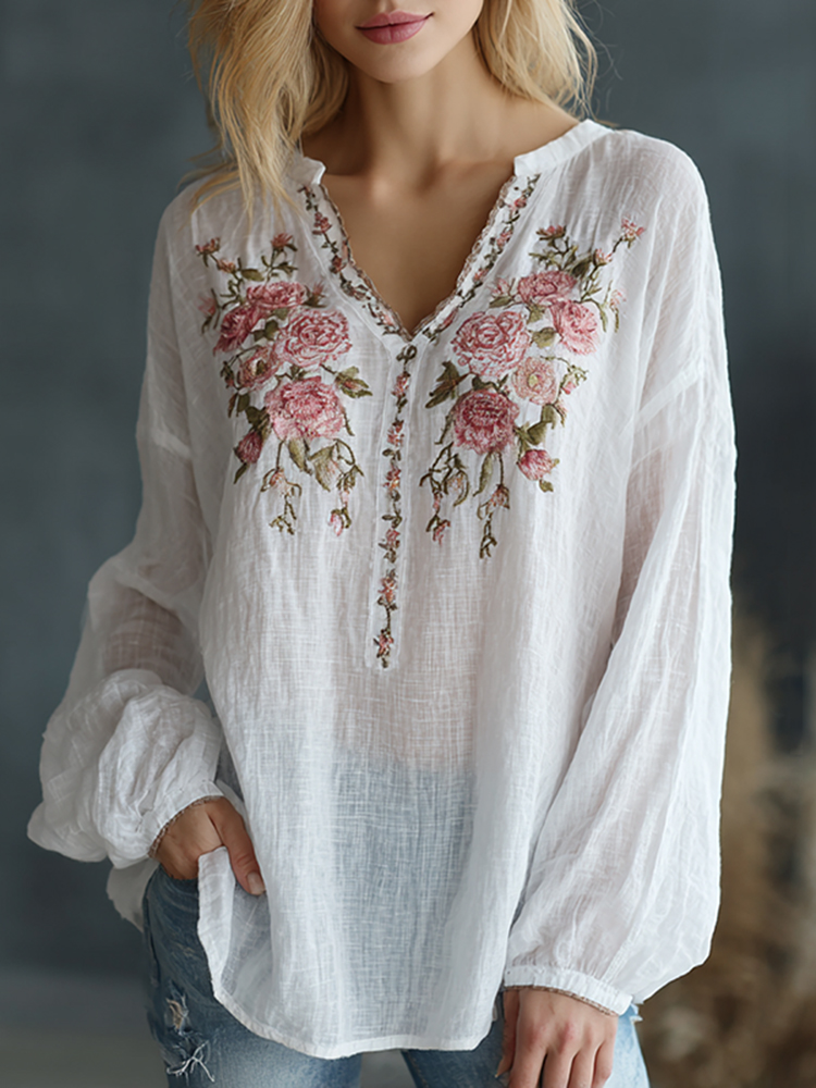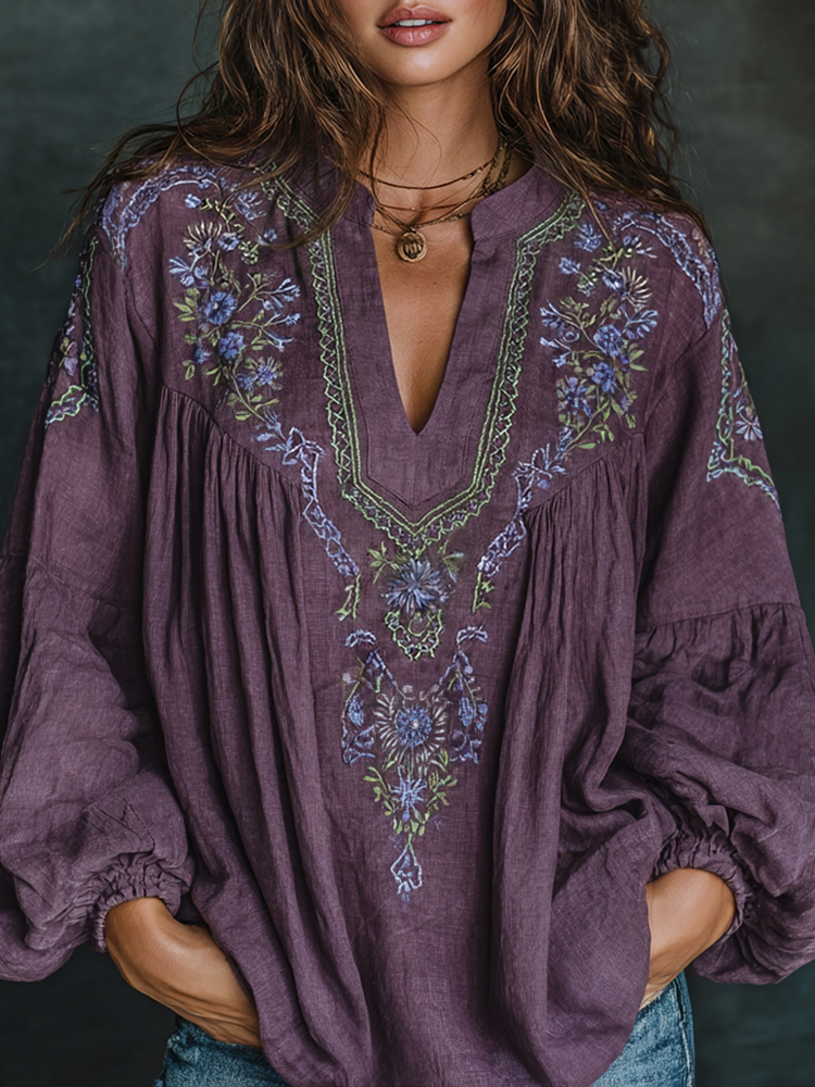 Women's Boho Floral Embroidered Art Print Flowy Linen Blend Casual Tops