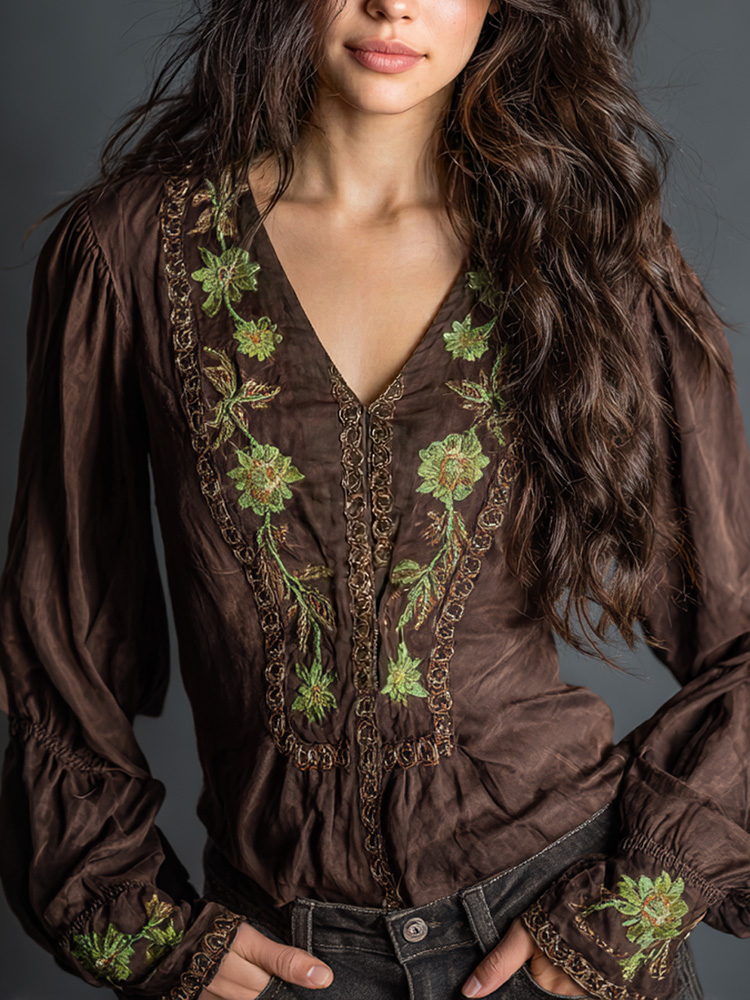 Women's Retro Floral Lace Embroidery Art V-neck Shirt