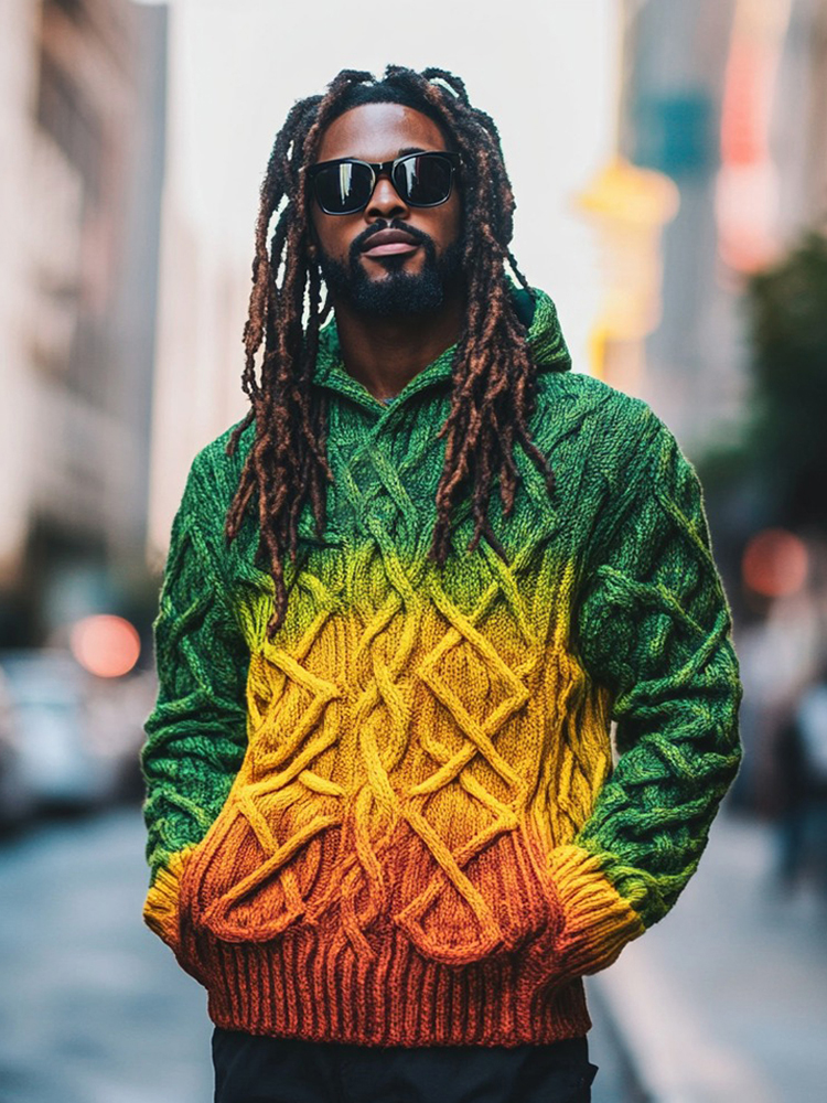 Reggae Gradient Cable Knit Hooded Pocket Sweater