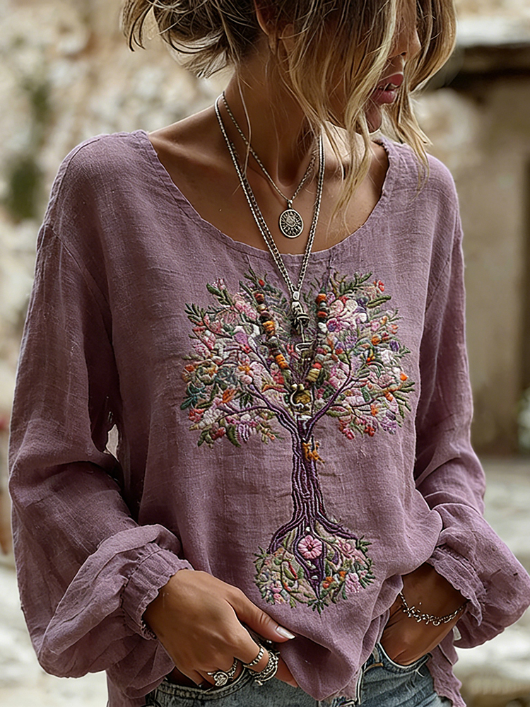 Women's Vintage Floral Print Long Sleeve Linen Blend T-shirt