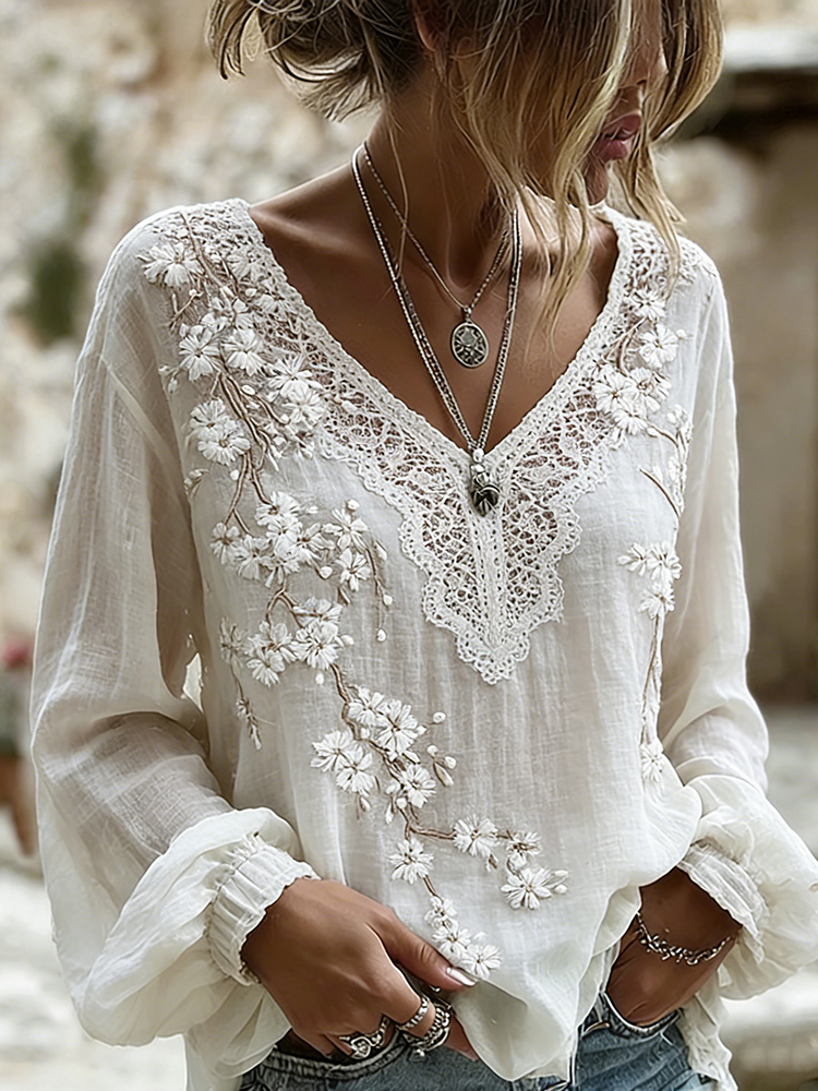 Women's Bohemian White Rose Patchwork Crew Neck Long-sleeve T-shirt