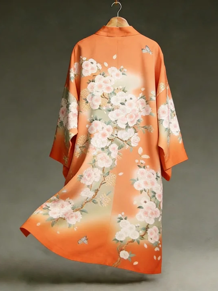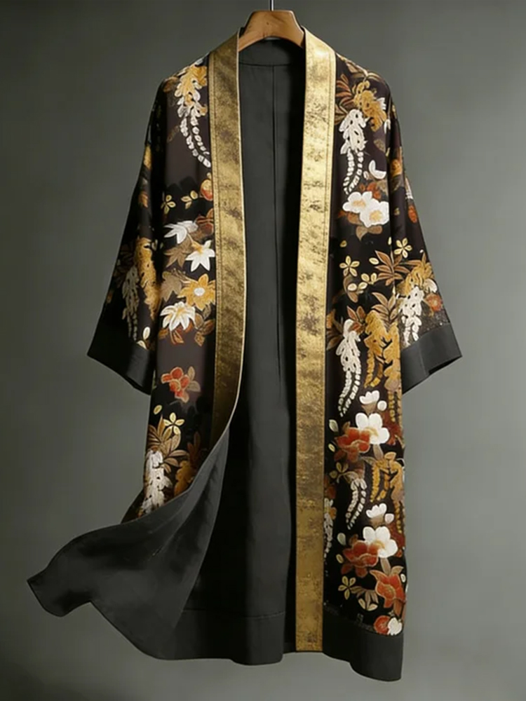 Japanese Romantic Floral Art Linen Long Kimono