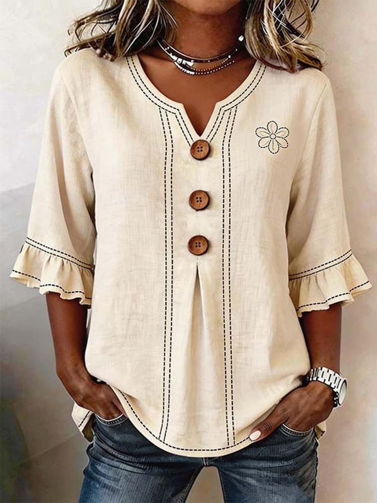 Japanese Art Retro Pattern Design Linen Women's V-neck Top