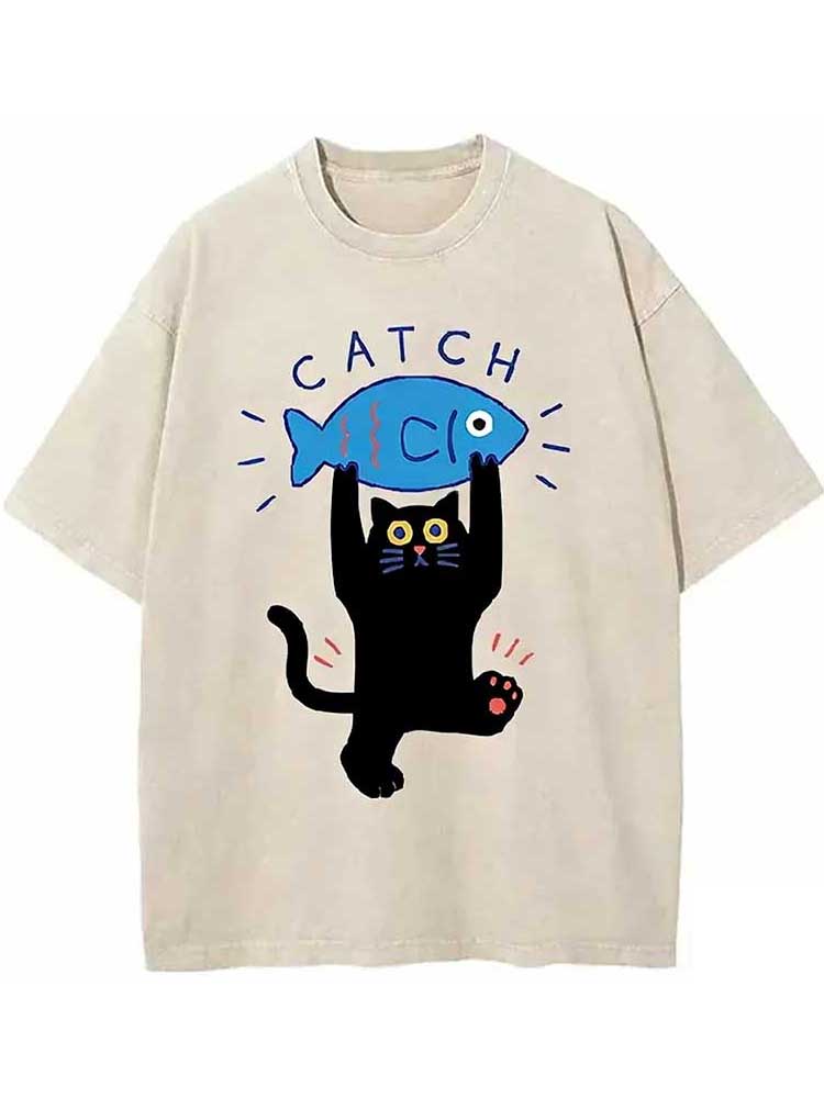 Cat Catching Fish Washed T-shirt