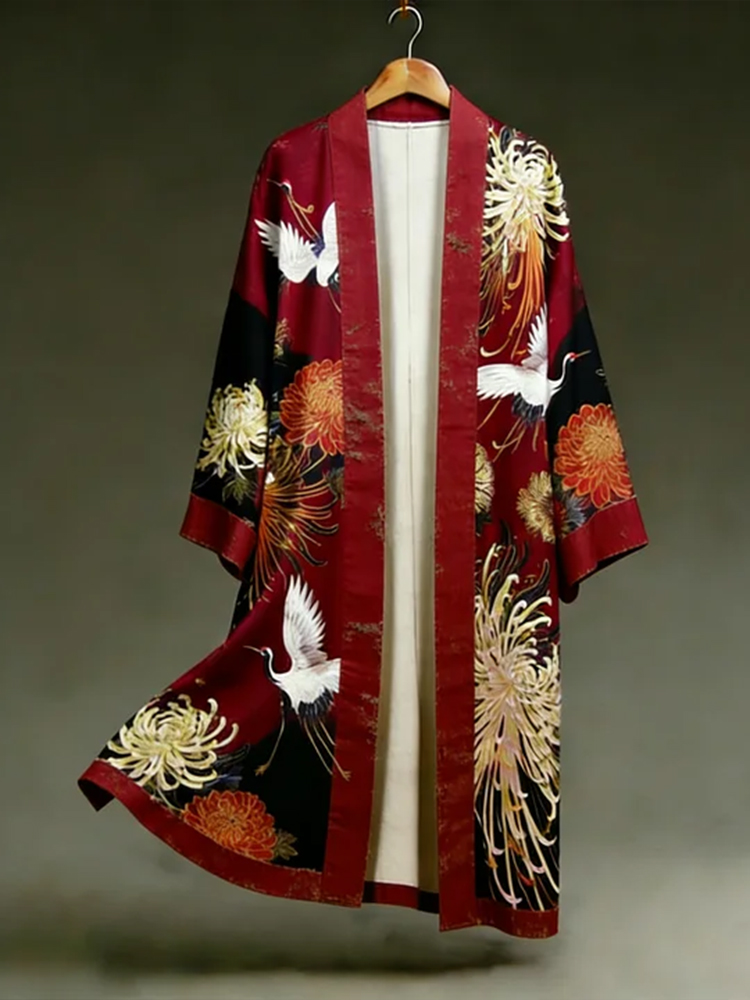 Japanese-style Crane And Chrysanthemum Embroidered Art Linen Long Kimono