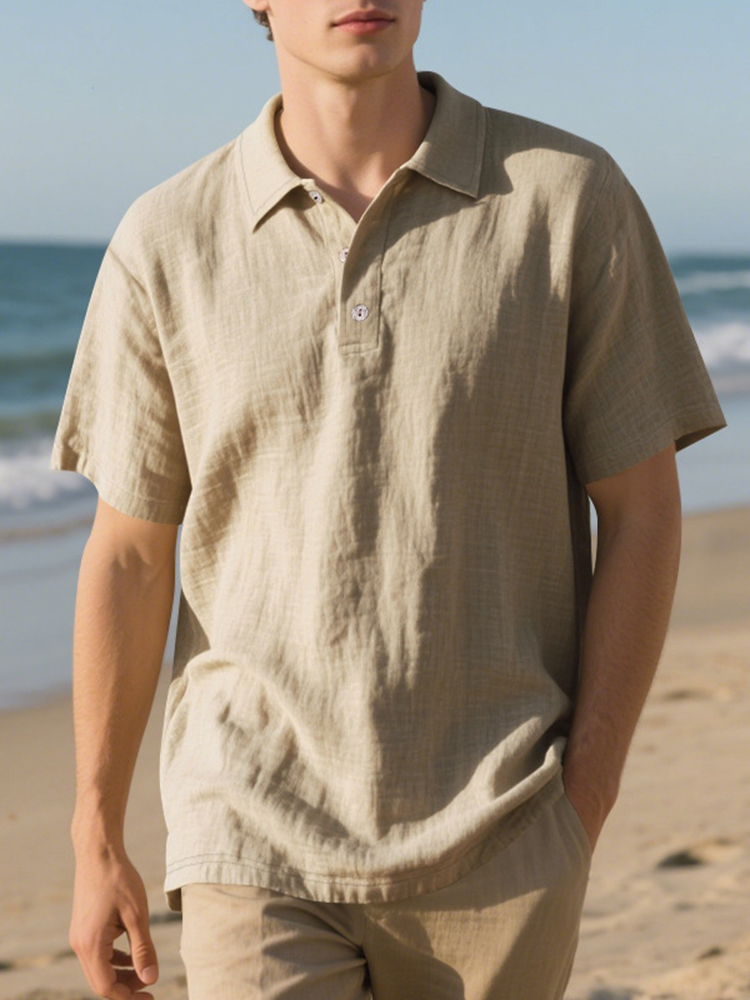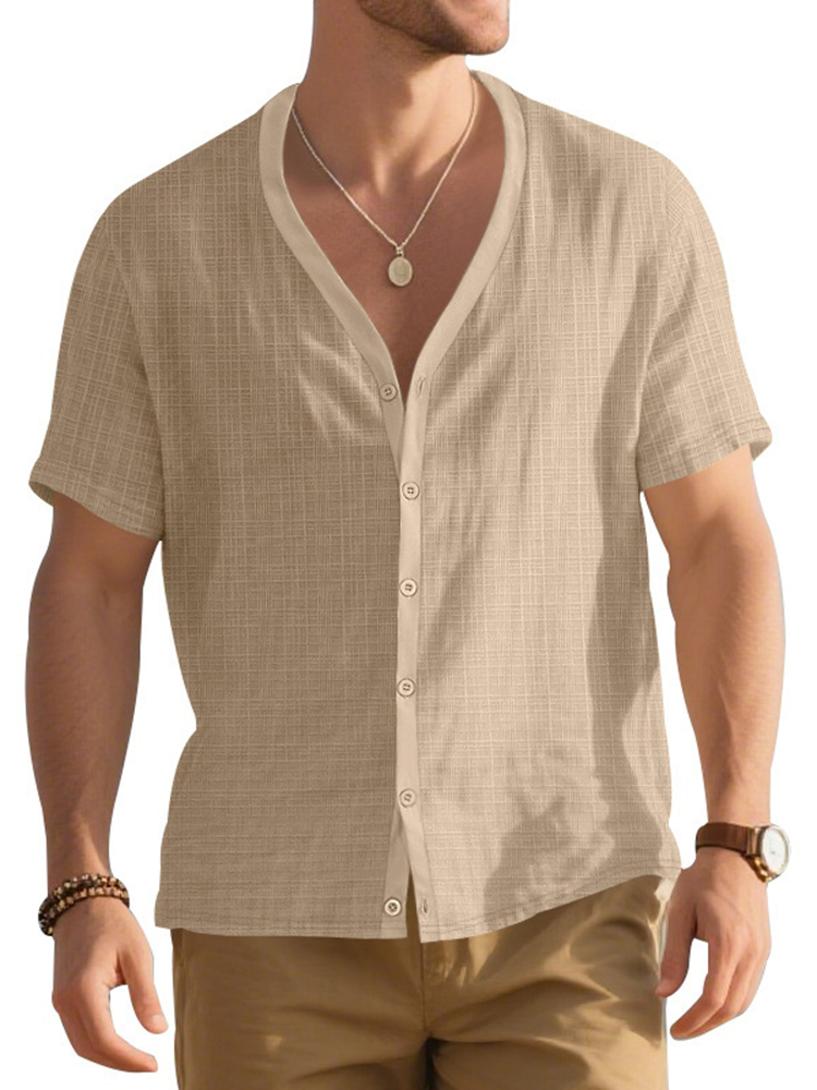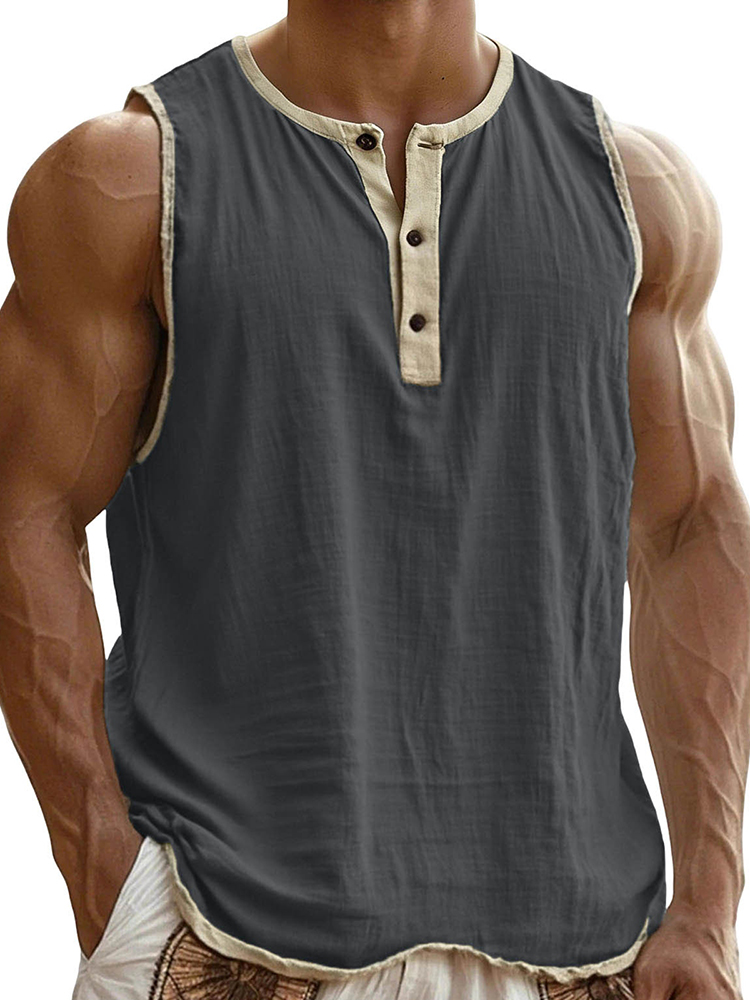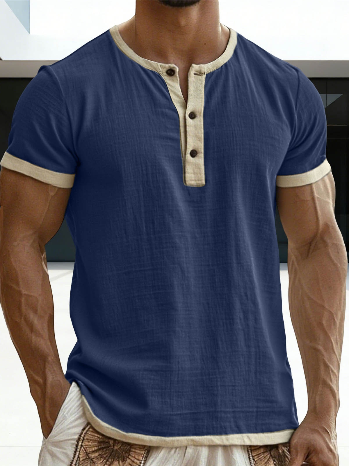 Men's Retro Color-blocked Henley Collar Cotton-linen Shirt