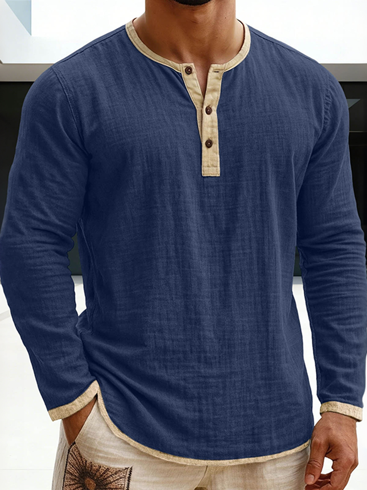 Men's Retro Color-blocked Henley Collar Cotton-linen Long-sleeved Shirt