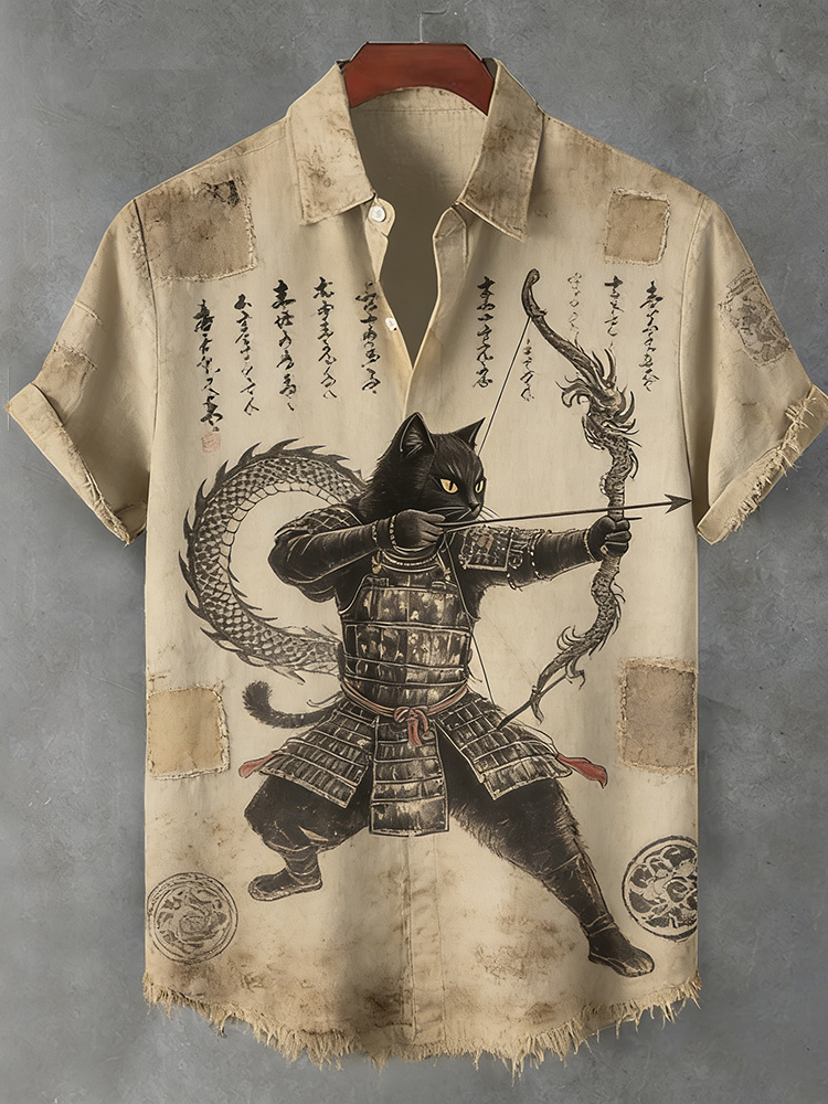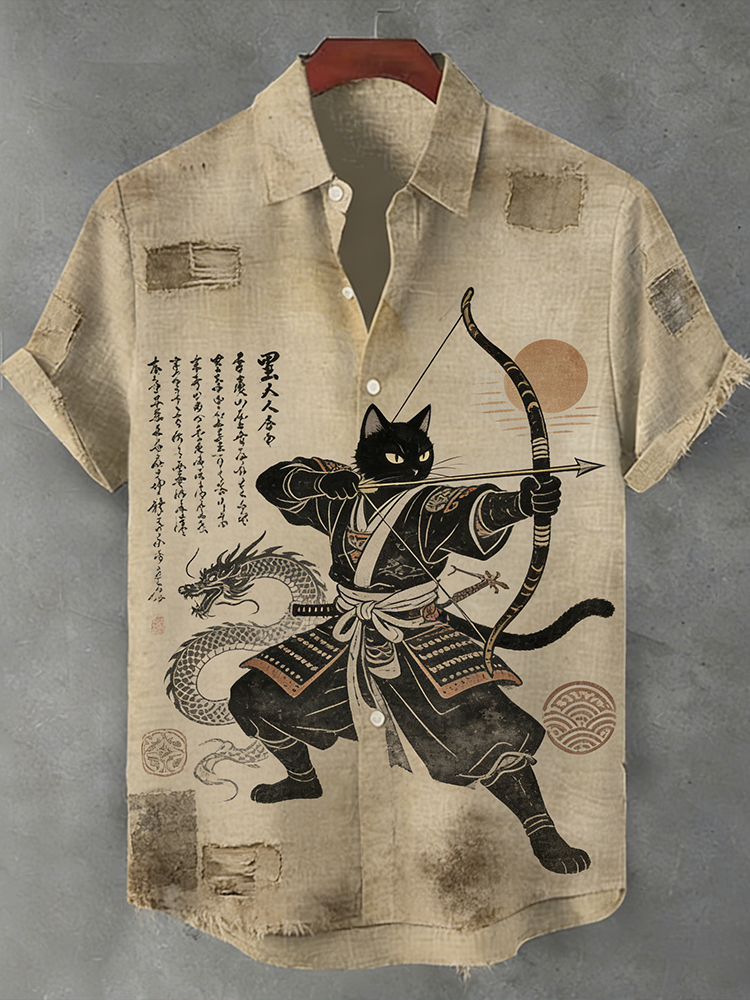 Men's Retro Cat Samurai And Dragon Art Print Short Sleeve Shirt