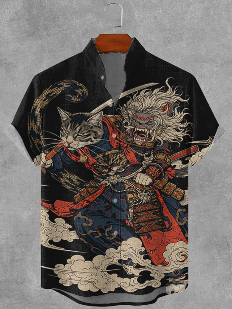 Men's Vintage Japanese Samurai Cat Print Casual Button Shirt