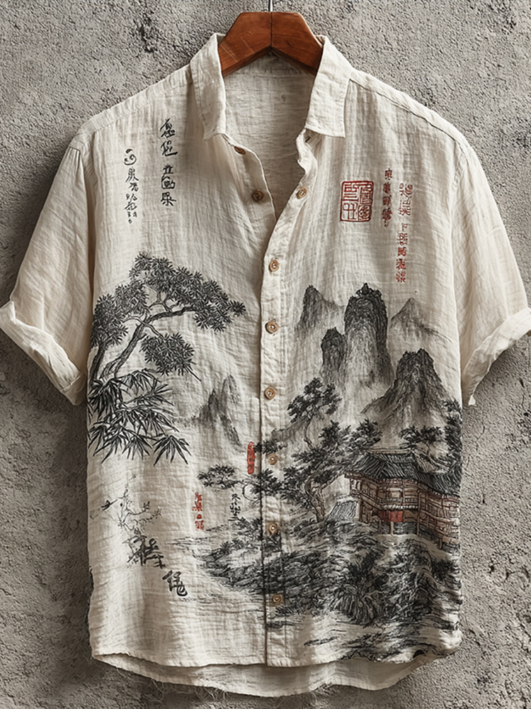 Men's Retro Japanese Dragon Art Linen Blend Short-sleeve Shirt