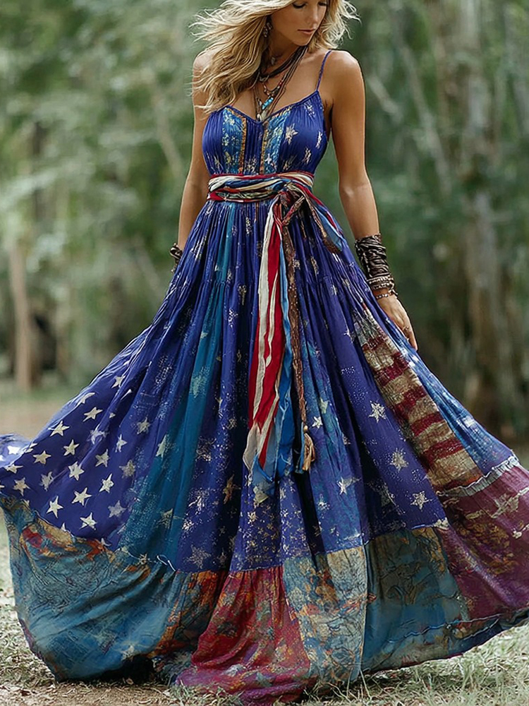 Women's Retro Independence Day Flag Patchwork Color Block Dress