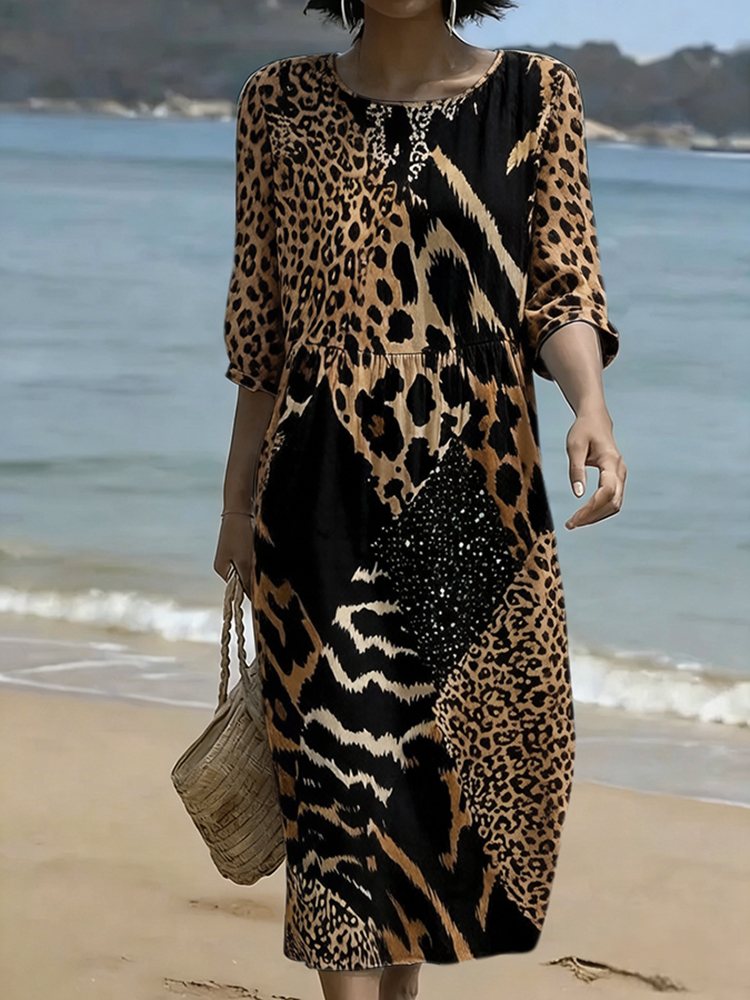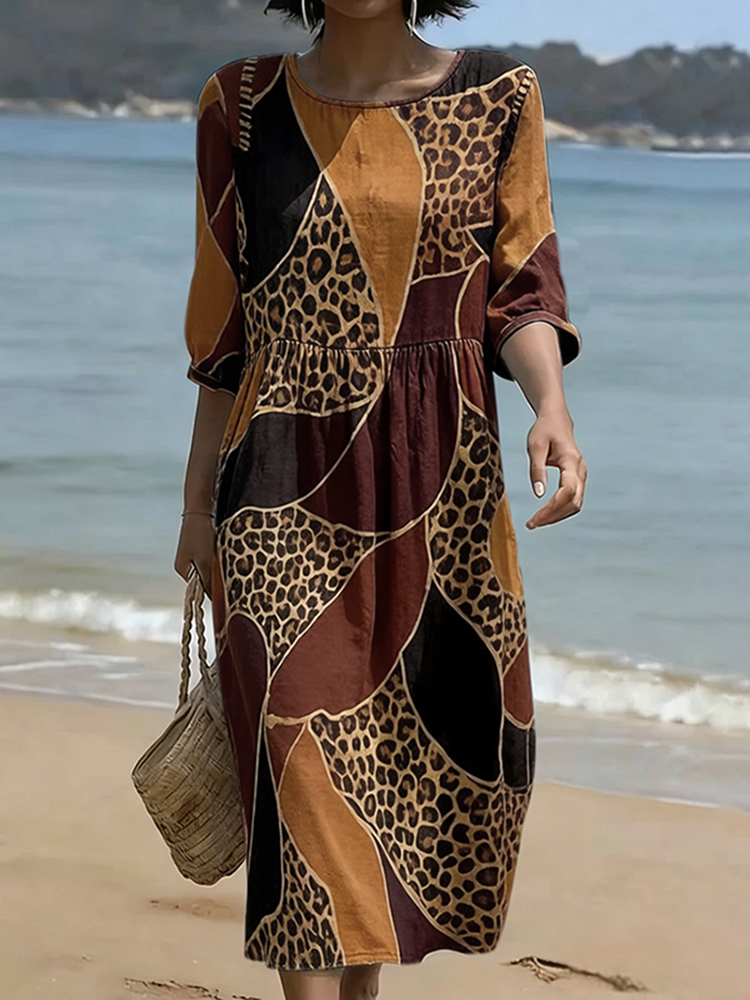Retro Leopard And Animal Patchwork Art Linen Blend Loose Three-quarter Sleeve Dress