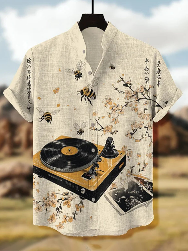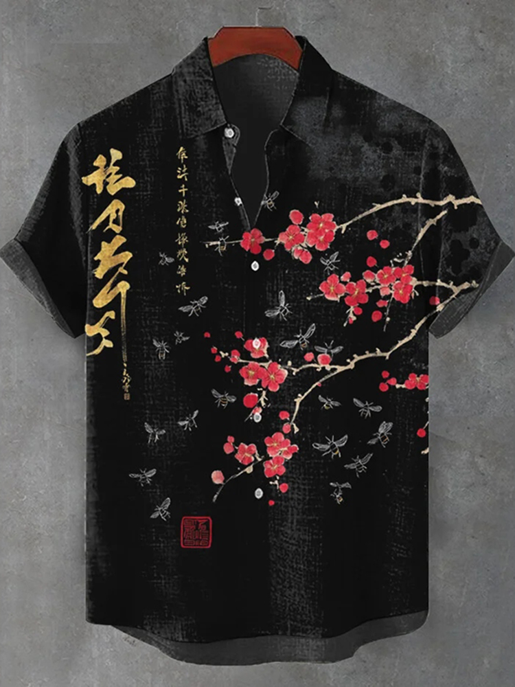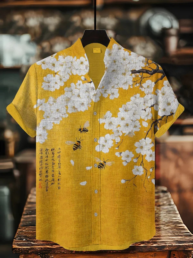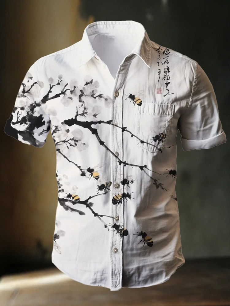 Men's Retro Calligraphy Cherry Blossom Tree Several Bees Print Casual Shirt