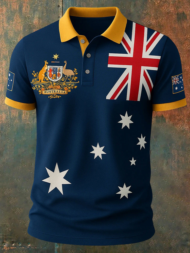 Vintage Australian Flag Crest Printed Casual Cotton Short Sleeve Polo Shirt