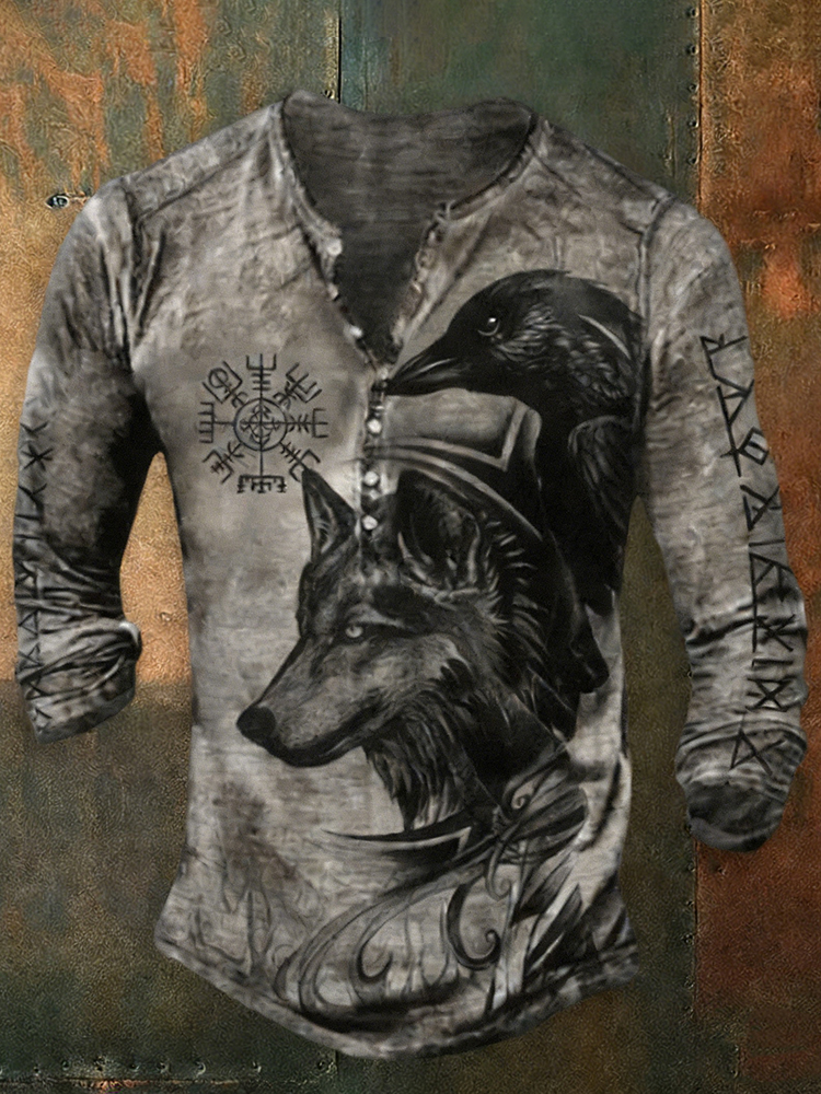 Men's Retro Viking Wolf And Raven Pattern Casual T-shirt