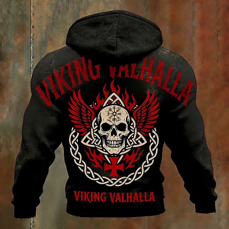Men's Viking Valhalla With Skull Runes Flame Wing Graphic Print Hoodie